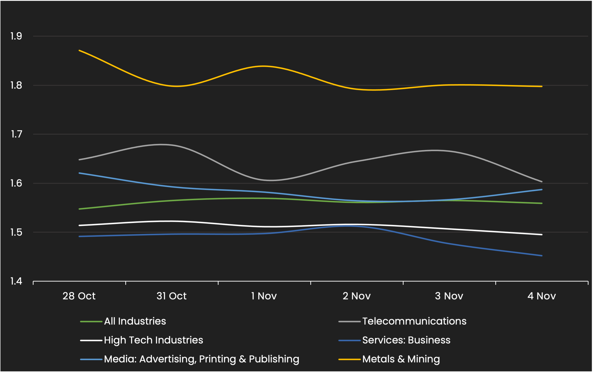Displays the HY Corp average industry price by sector between 10/29/21 – 11/5/21 Results are based on 5 select industry sectors, however, we offer data across 36 sectors