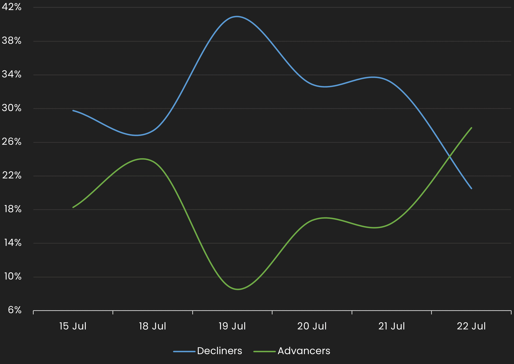 Reveals the percent of Muni bonds increasing in price (advancers) vs. decreasing in price (decliners) between 1/21/22 – 1/28/22