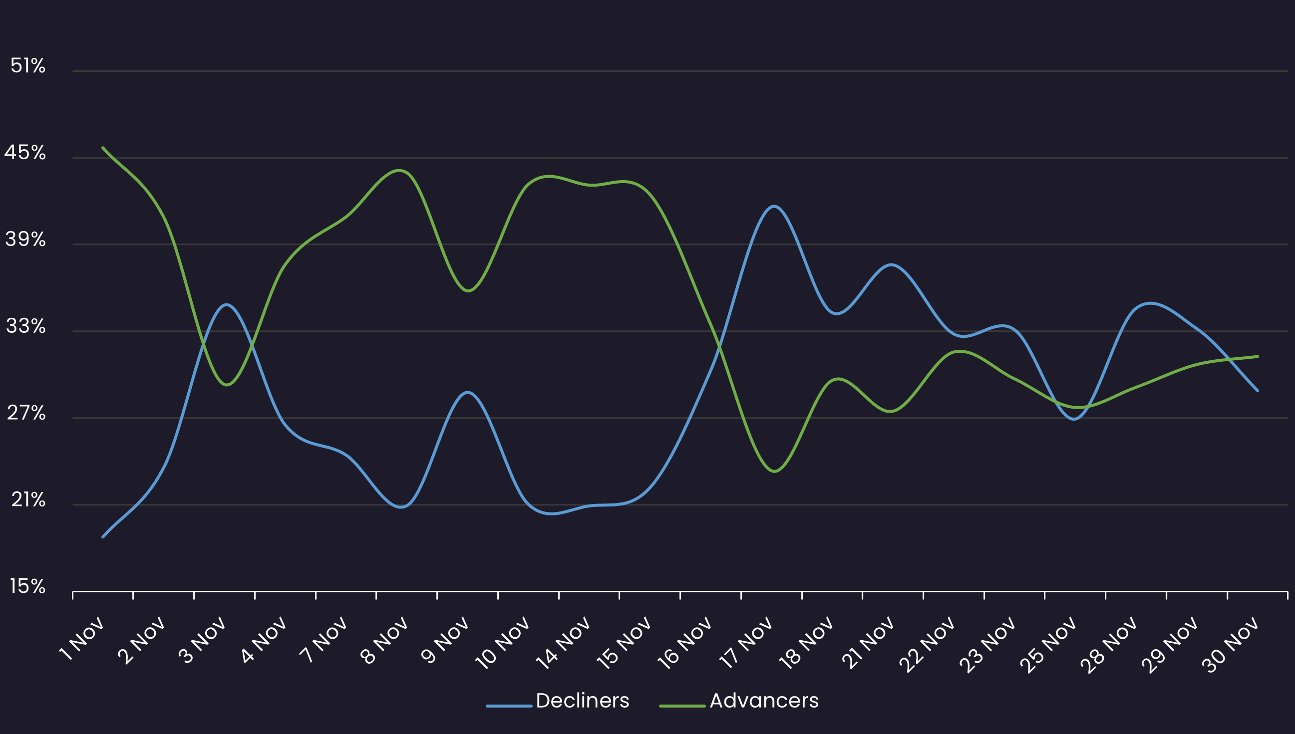 Reveals the percent of Muni bonds increasing in price (advancers) vs. decreasing in price (decliners) between 11/26/21 – 12/3/21