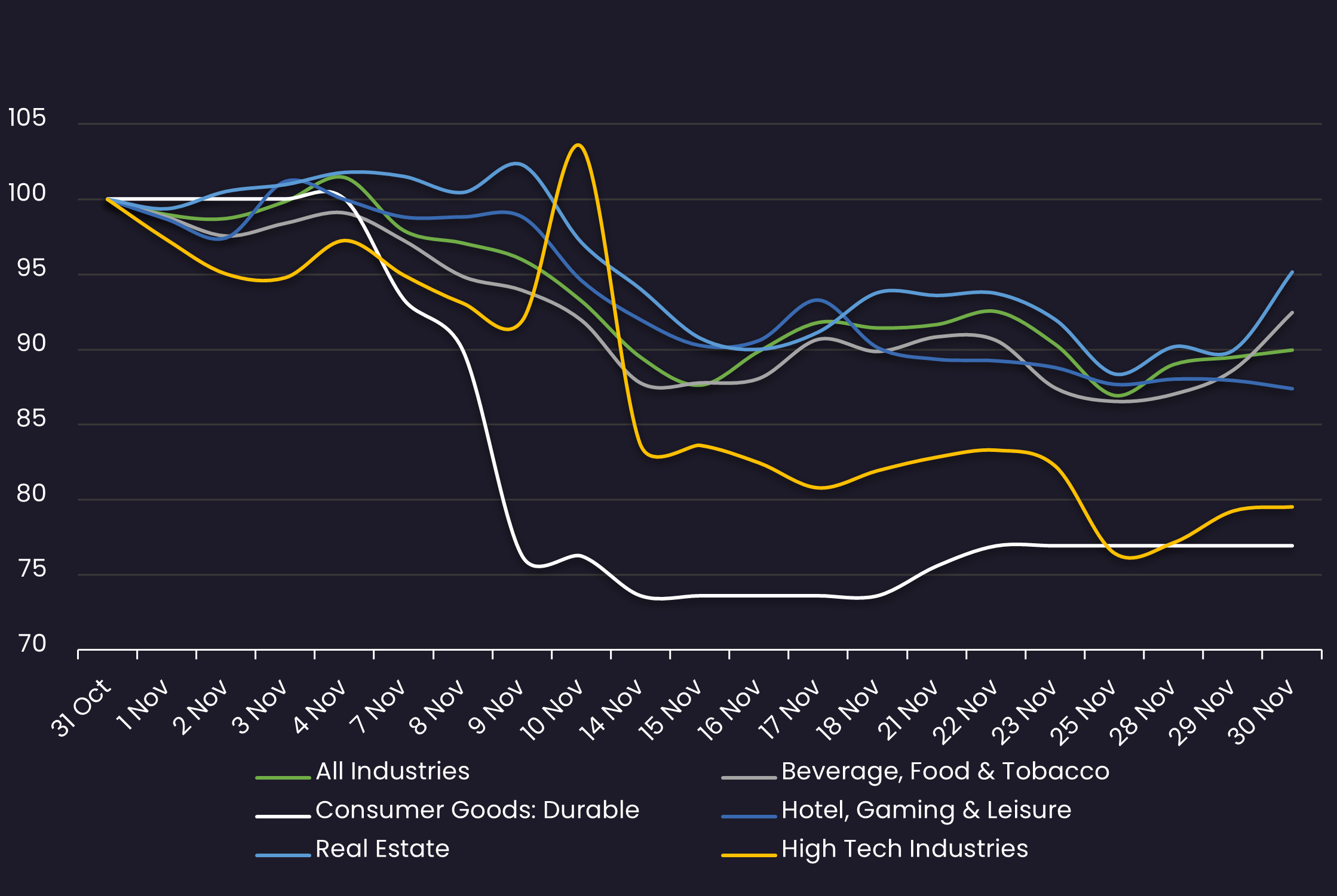 Displays the bid-offer spread by sector between 11/1/21 – 11/30/21 Results are based on 5 select industry sectors, however, we offer data across 36 sectors